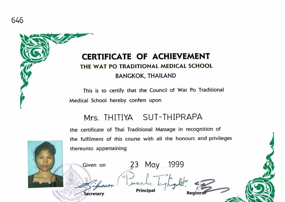 Ich bin zertifizierte Thaimassage- und Yogalehrerin und Mitglied in „The Union of Traditional Medicine Society of Thailand“.